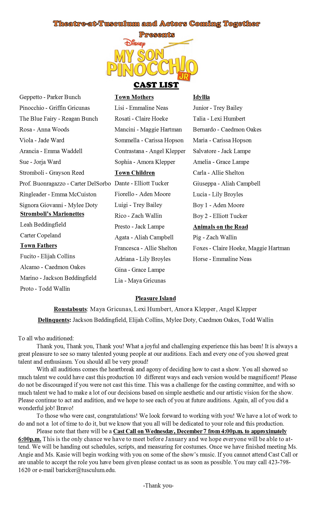 “My Son Pinocchio, JR” is based in part on the classic Walt Disney animated feature film “Pinocchio.” It is presented through special arrangement with Music Theatre International and is part of the Broadway Junior Collection. The musical includes the songs “When You Wish Upon a Star” and “I’ve Got No Strings” by Leigh Harline and Ned Washington from the animated film.
