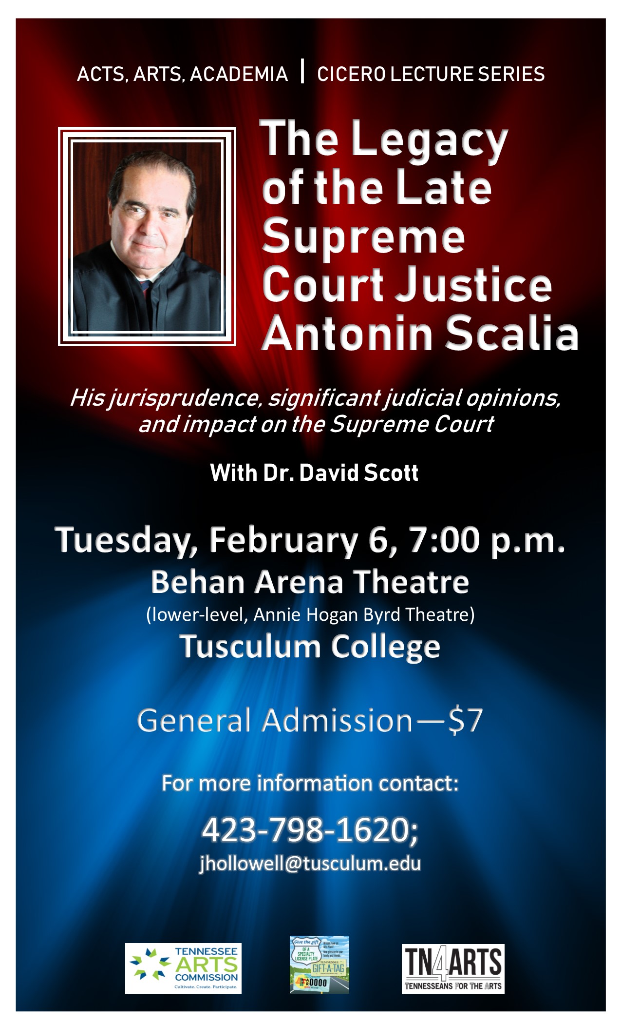 A lecture on the legacy of the Late Supreme Court Justice Antonin Scalia will be held on Tuesday, Feb. 6, beginning at 7 p.m. at the Behan Arena Theatre in the Annie Hogan Byrd Fine Arts Building on the Tusculum campus.