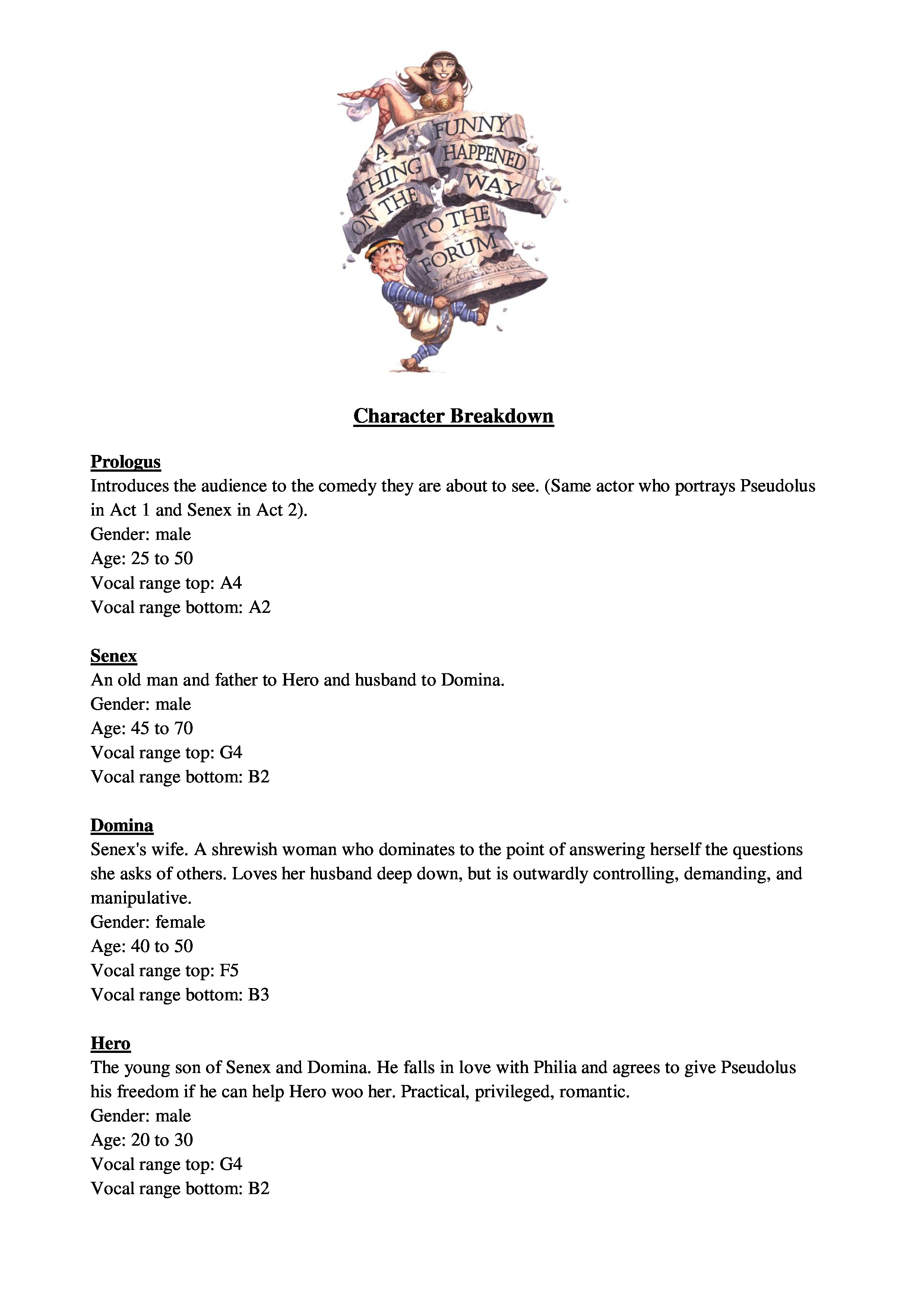 Music Theatre International describes the musical as “Broadway’s greatest farce” and as “light, fast-paced, witty, irreverent and one of the funniest musicals ever written. ‘A Funny Thing Happened on the Way to the Forum’ takes comedy back to its roots, combining situations from time-tested, 2,000-year-old comedies of Roman playwright, Plautus, with the infectious energy of classic vaudeville. ‘A Funny Thing Happened on the Way to the Forum’ is a nonstop laugh fest in which Pseudolus, a crafty slave, struggles to win the hand of a beautiful, but slow-witted, courtesan named Philia for his young master, Hero, in exchange for freedom. The plot twists and turns with cases of mistaken identity, slamming doors and a showgirl or two.”